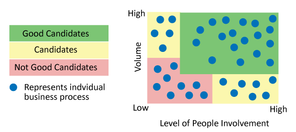 Some other considerations that should be taken into effect include the complexity of the process and the amount of judgment involved versus rules-based decisions.